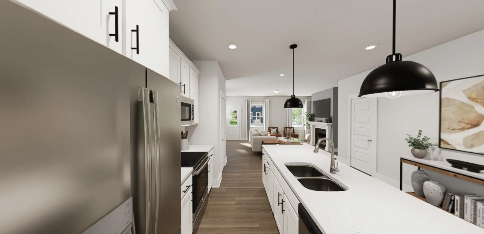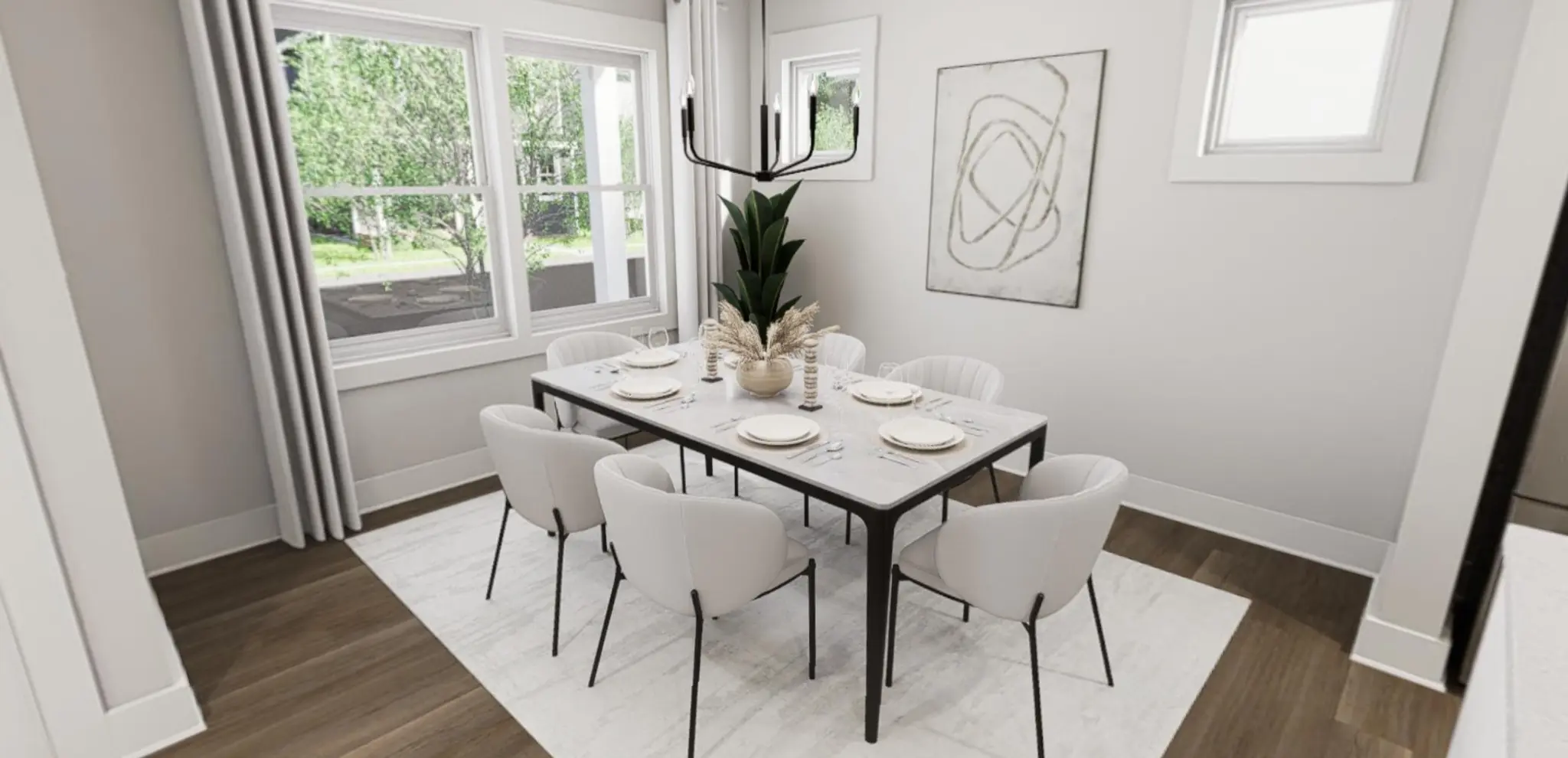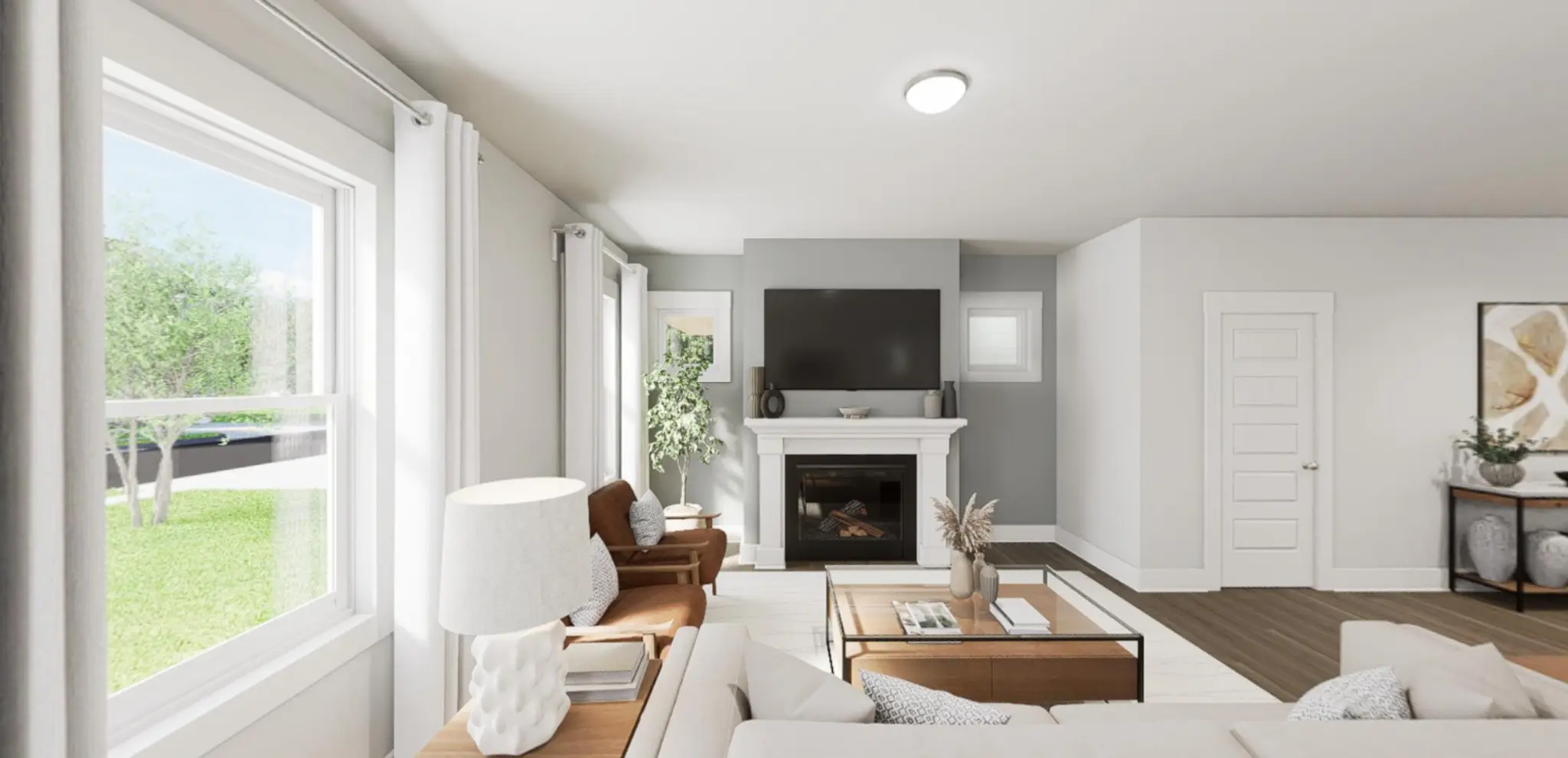 The Yin & Yang interior package sets a calm and balanced tone from the moment you walk in. Luxury vinyl plank flooring runs through the main living areas and continues up the stairs for a clean, durable finish that anchors the home. The kitchen features quartz countertops, a spacious island, gas range and hardwood dovetail soft-close drawers. The dining area connects to a comfortable family room with a fireplace and transom windows that brighten the space.