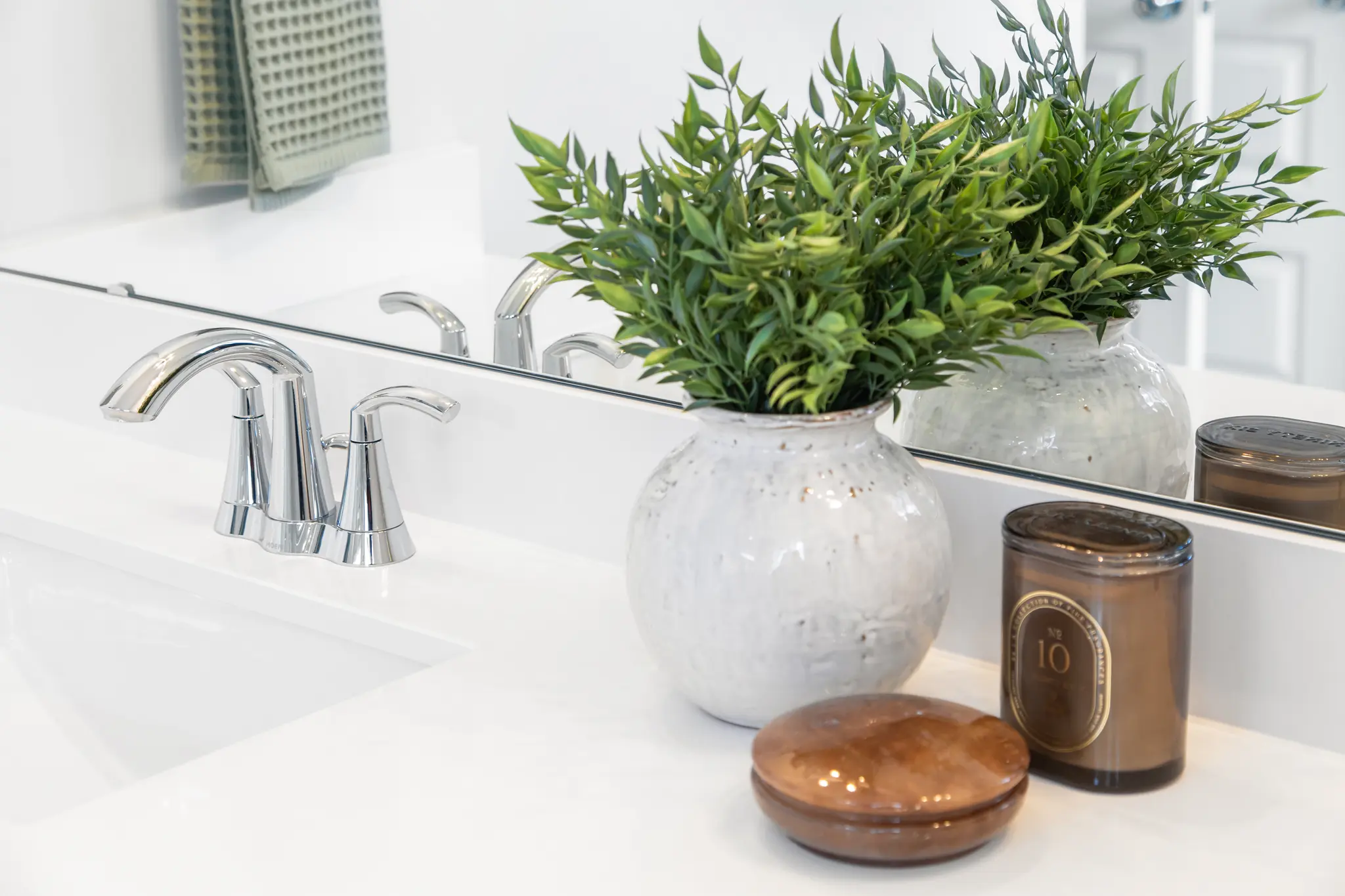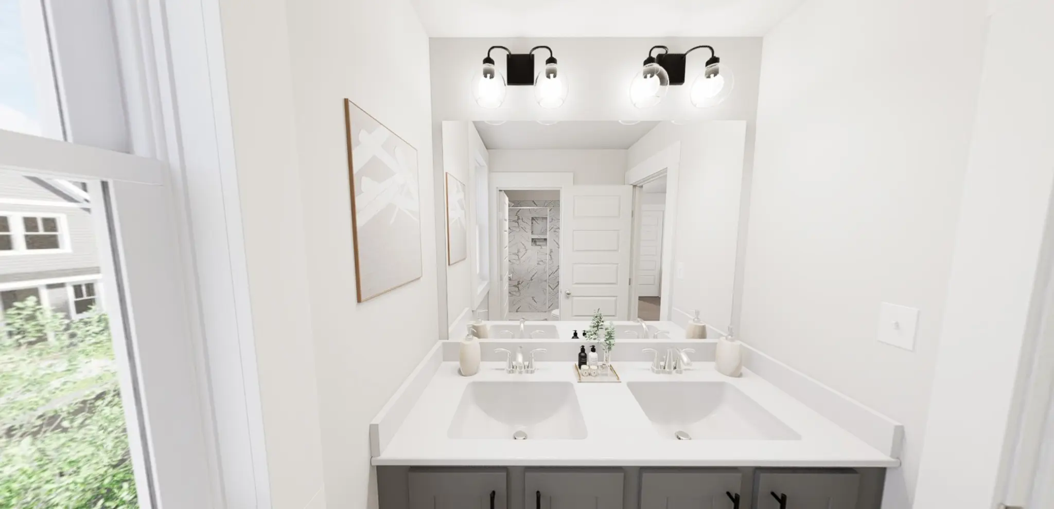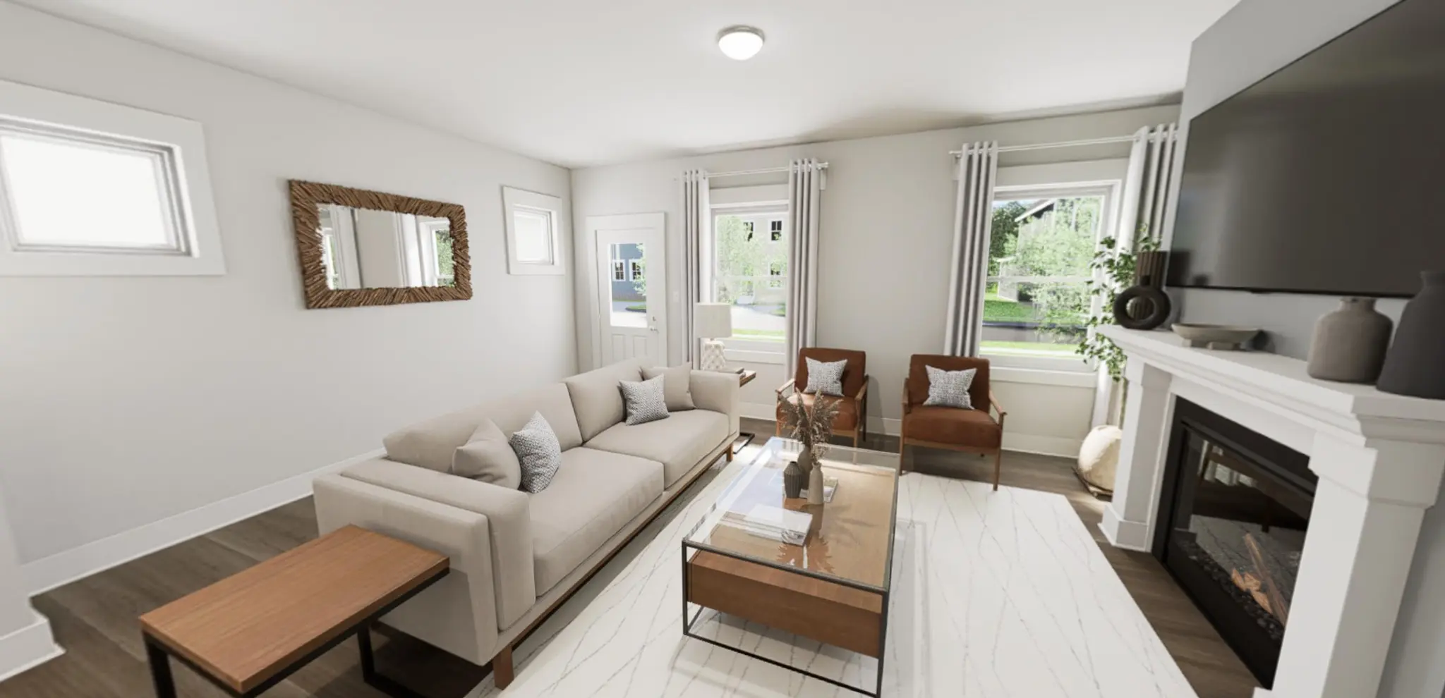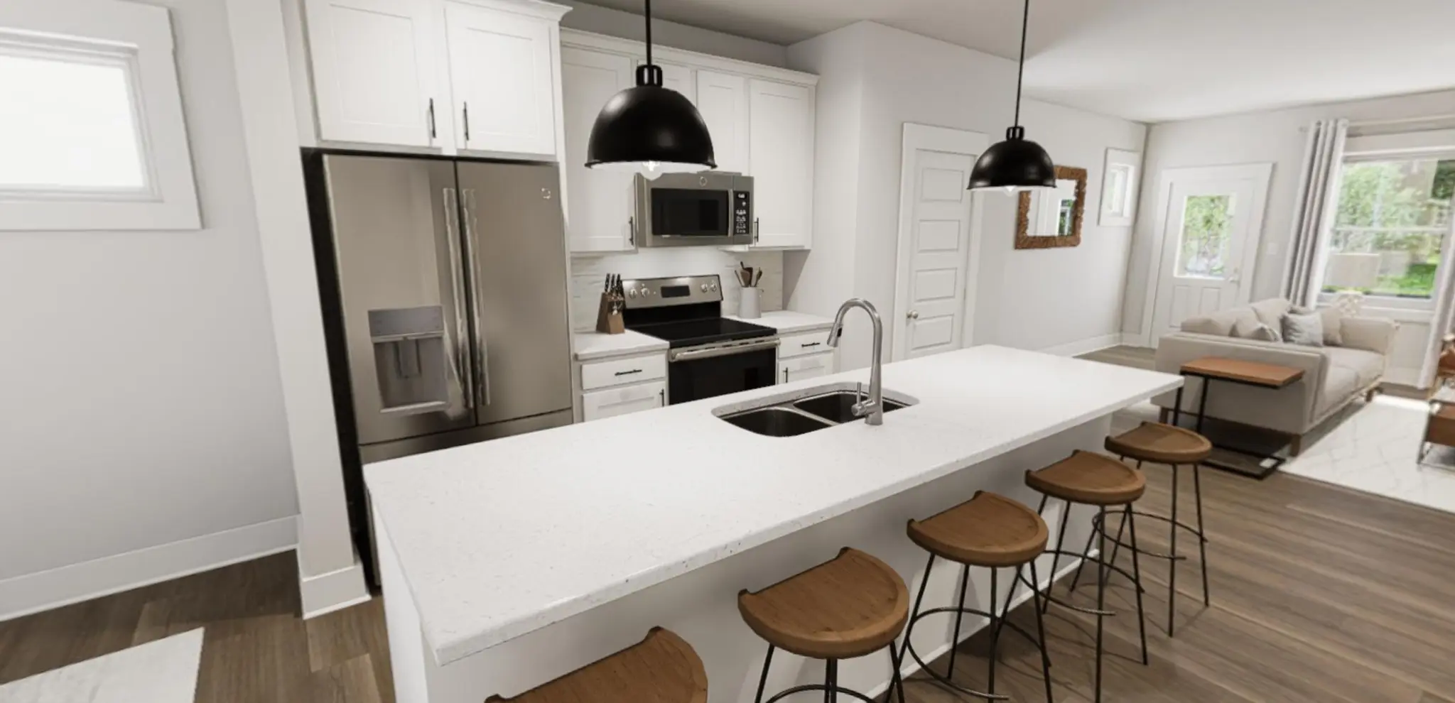 The Yin & Yang interior package sets a calm and balanced tone from the moment you walk in. Luxury vinyl plank flooring runs through the main living areas and continues up the stairs for a clean, durable finish that anchors the home. The kitchen features quartz countertops, a spacious island, gas range and hardwood dovetail soft-close drawers. The dining area connects to a comfortable family room with a fireplace and transom windows that brighten the space.