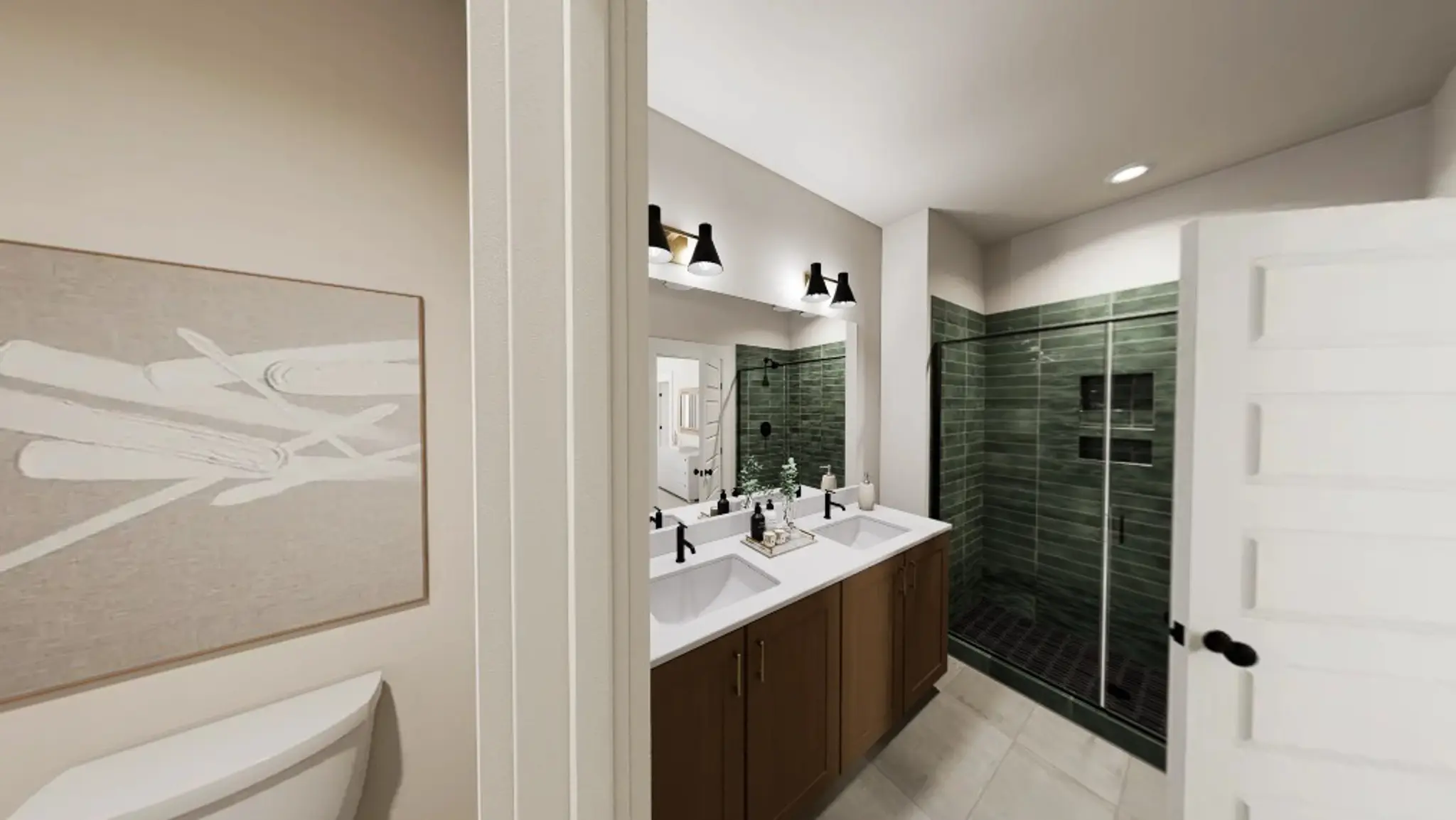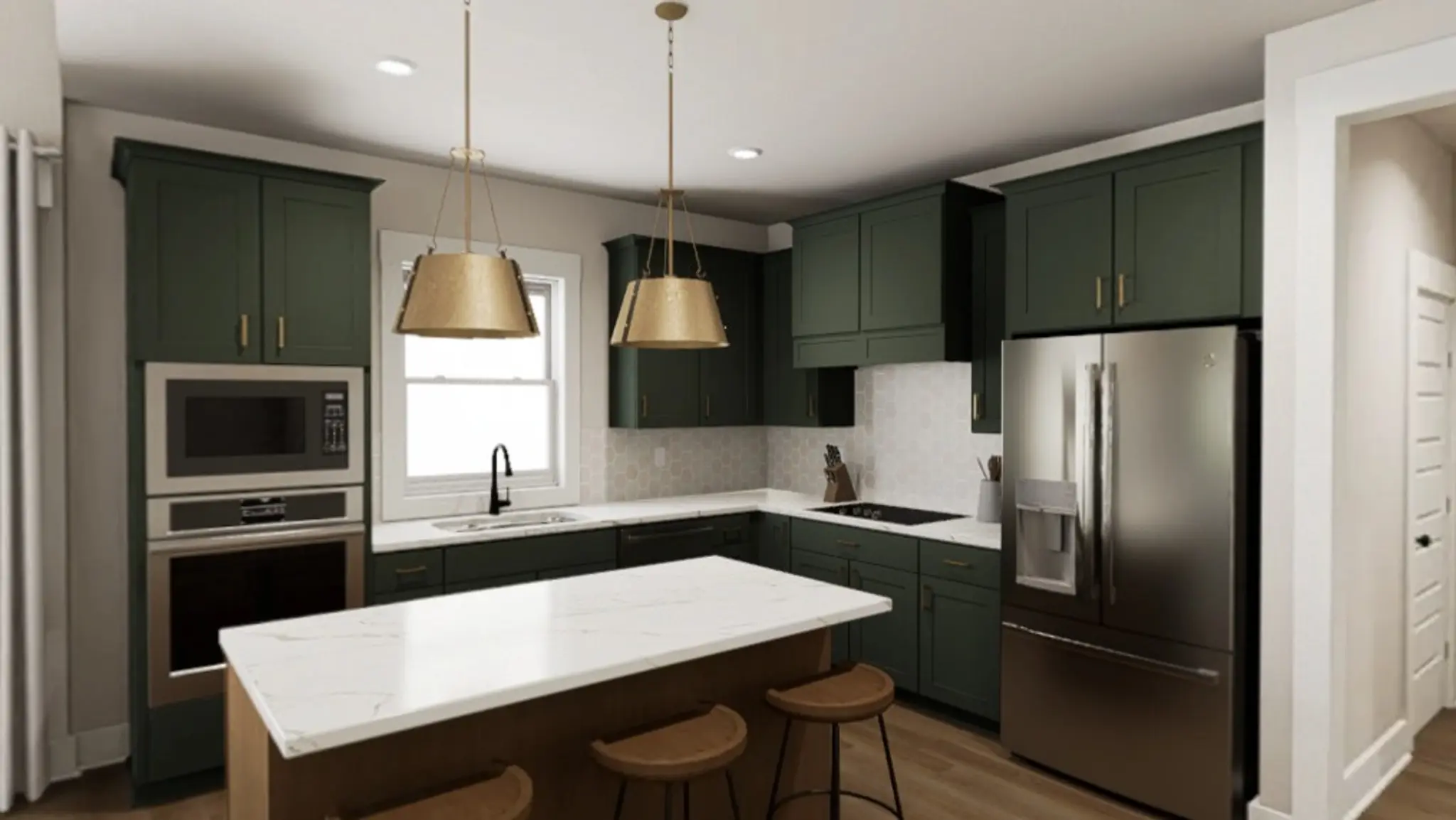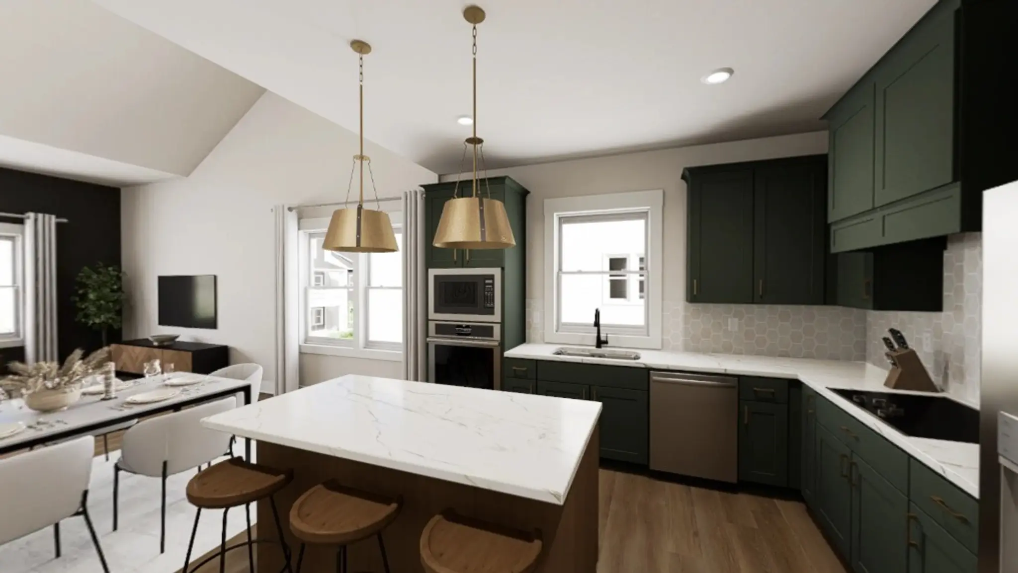 Start your story in the welcoming entry, where a mudroom offers the perfect spot to drop your bags, kick off your shoes, and ease into the day. Up one flight, the main living area reveals itself, a sunlit haven of open-concept living, where the kitchen, dining, and family room come together in joyful flow. The Elphaba and Glinda curated package brings bold personality to the space, with two-tone cabinetry and sleek quartz countertops that shimmers with just the right amount of drama.