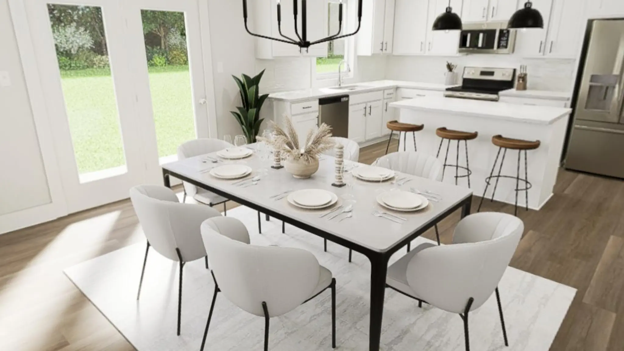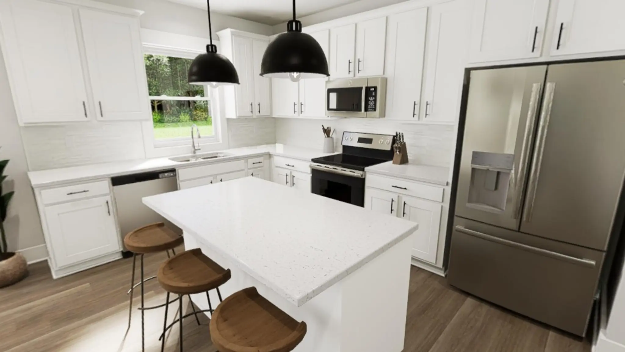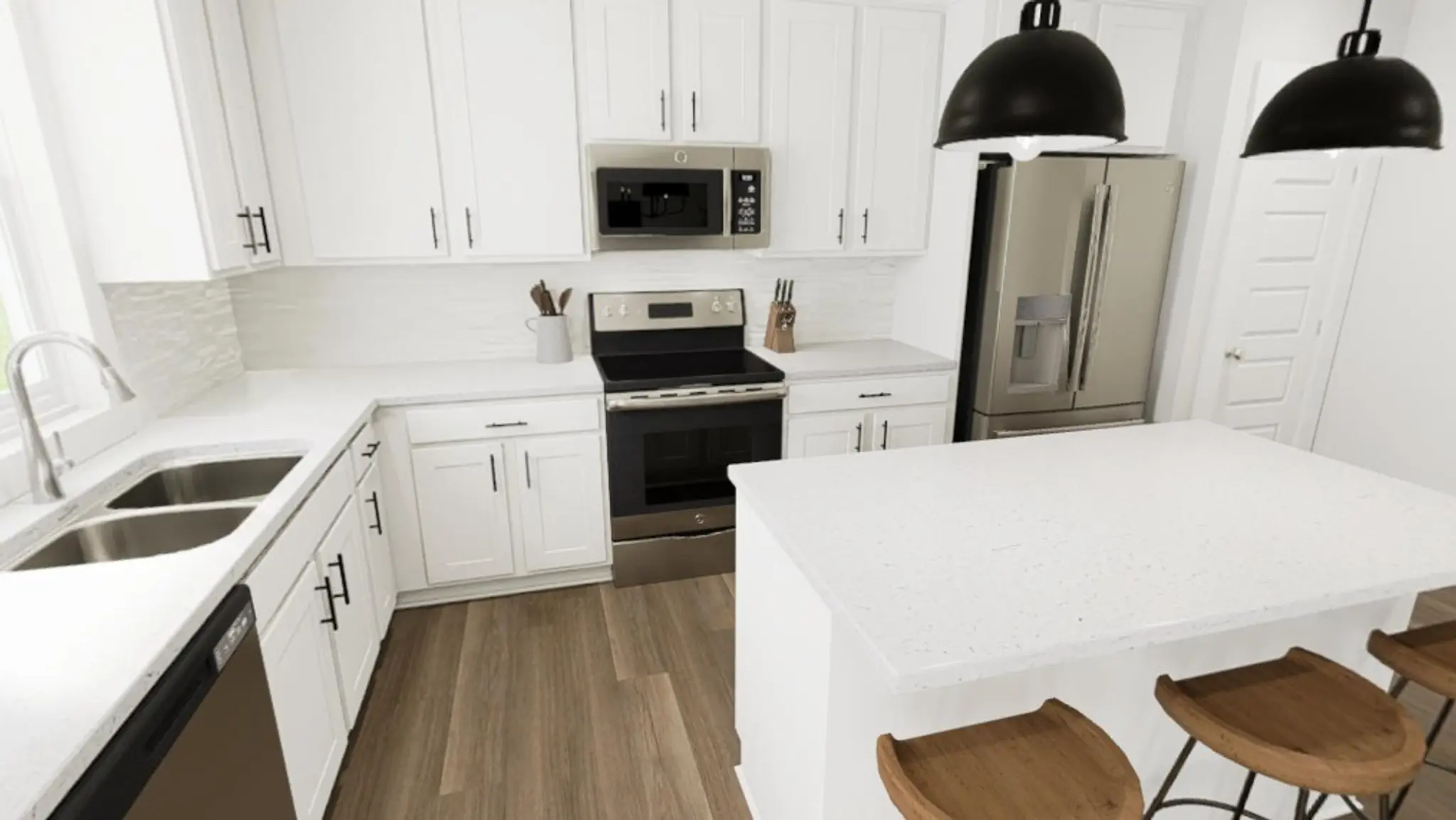 The heart of the home beats in the kitchen, styled with the striking Yin & Yang interior package. Crisp quartz countertops, sleek cabinetry with soft-close drawers, and a stunning backsplash set the stage for everyday meals and spontaneous dance parties. Luxury vinyl plank flooring stretches up the stairs and also in the study room, while a cozy family room adds warmth for everything from morning coffee to movie nights. A large covered porch sits off the dining area to enjoy your private backyard.