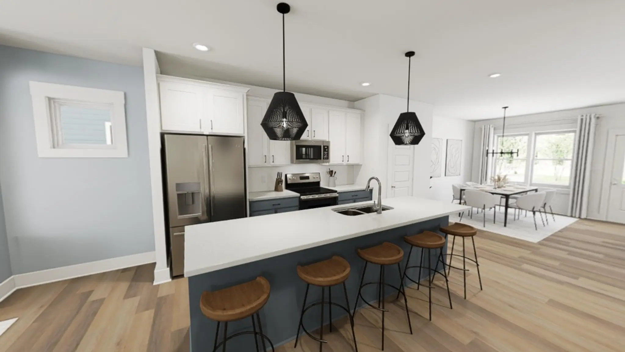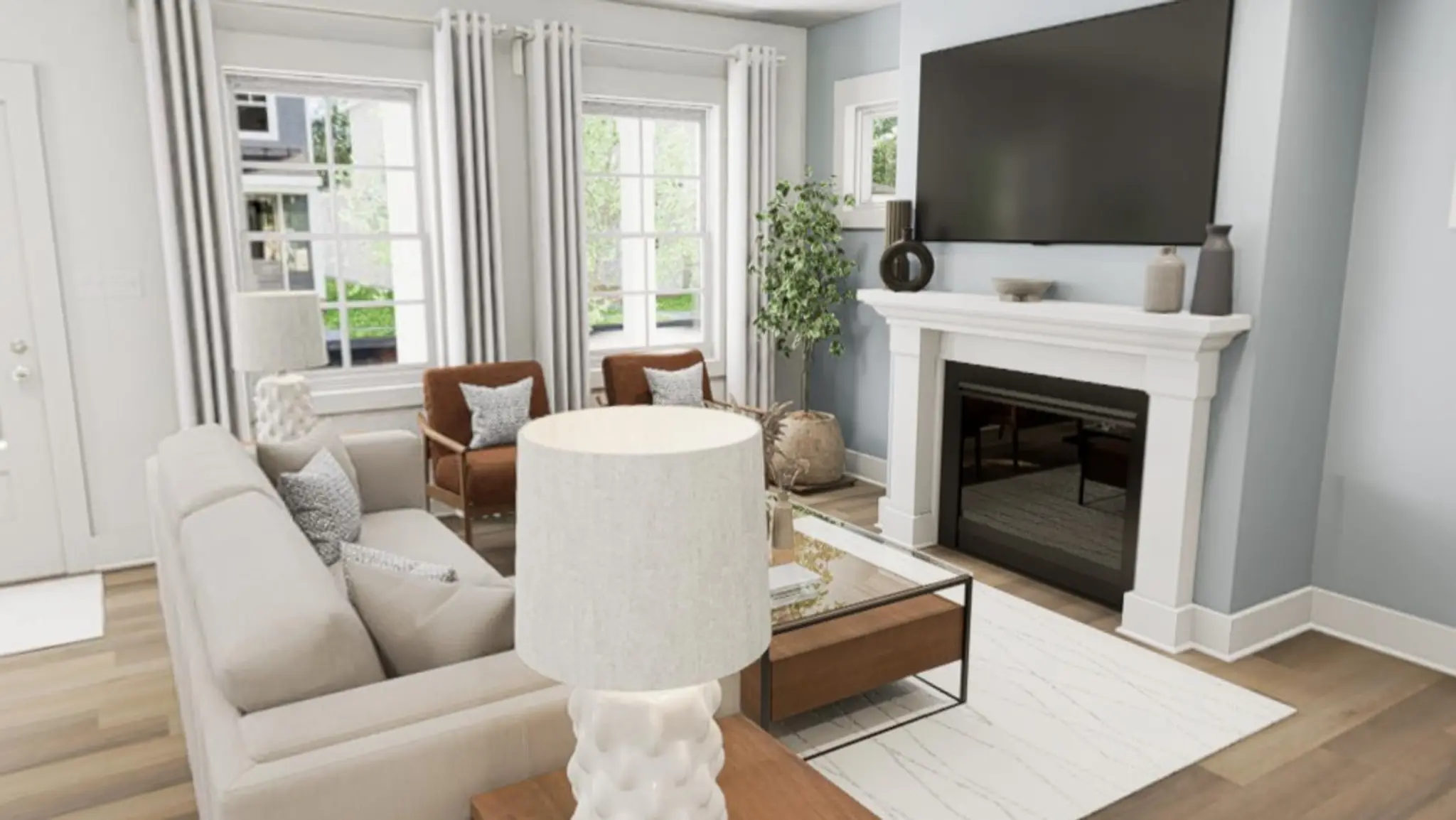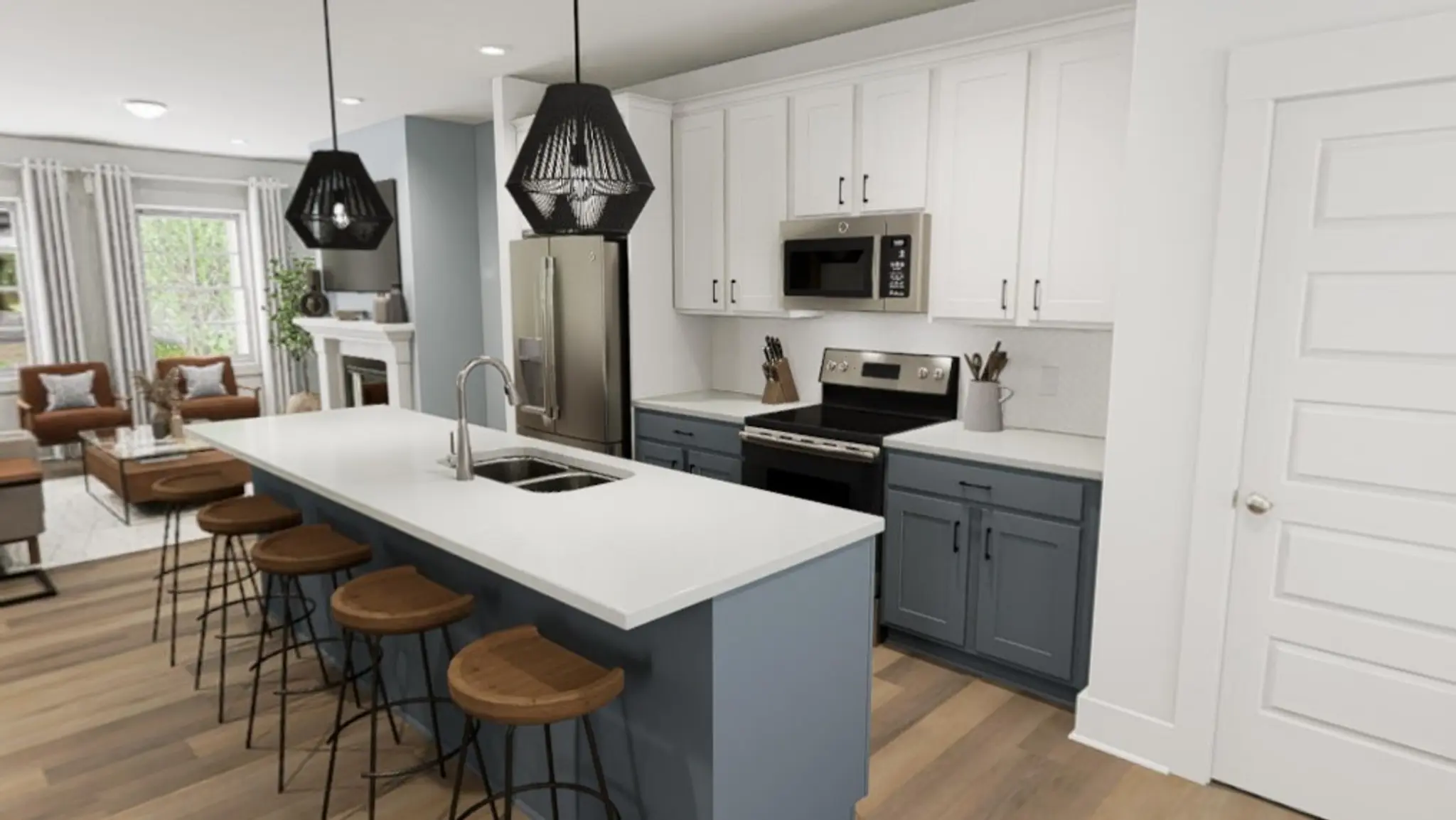 Step inside and feel the love in every corner. The Snoop & Martha interior brings warmth, style, and personality in perfect harmony. From the two-tone kitchen cabinets to the gleaming quartz counters, this kitchen isn’t just for cooking, it’s for connecting. The central location of the kitchen makes hosting feel effortless, whether you’re gathered around the island or enjoying the cozy dining space tucked at the back of the home. With luxury vinyl plank flooring and a feature fireplace with transom windows above, this home doesn’t just look good, it lives well, too.